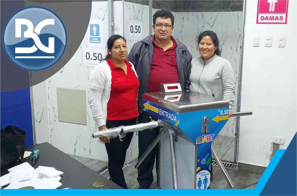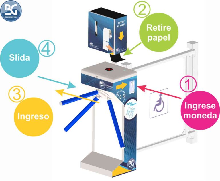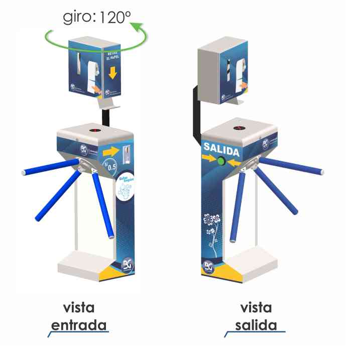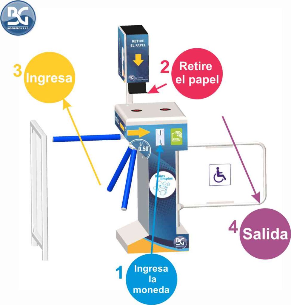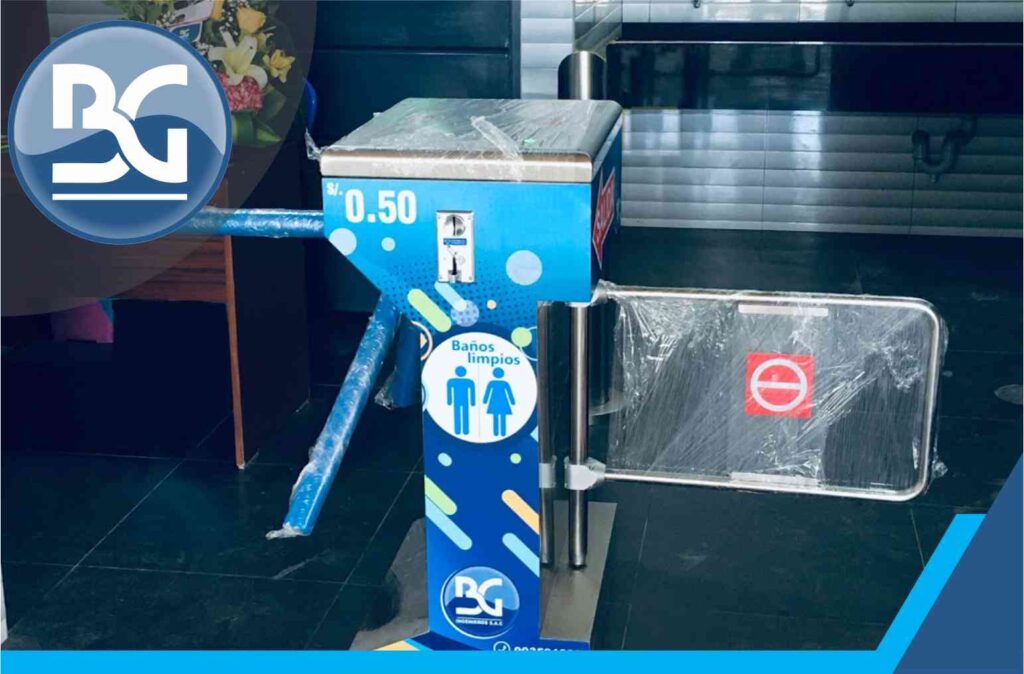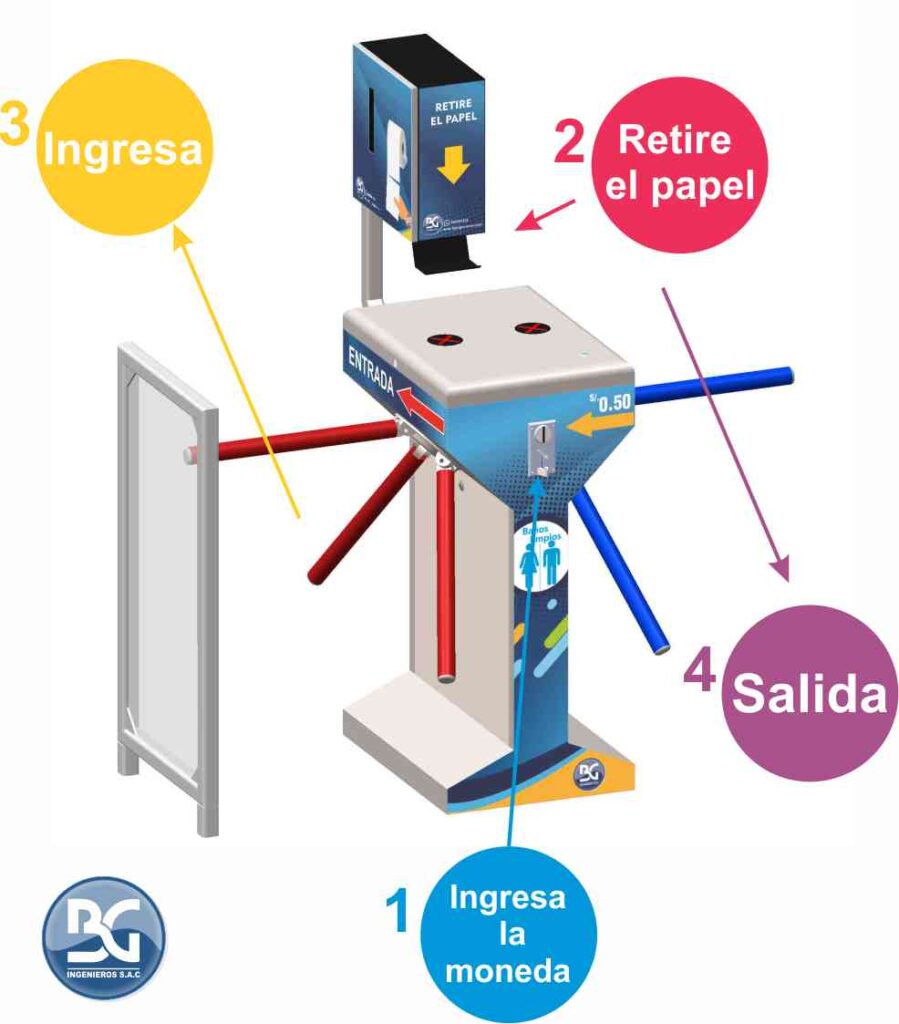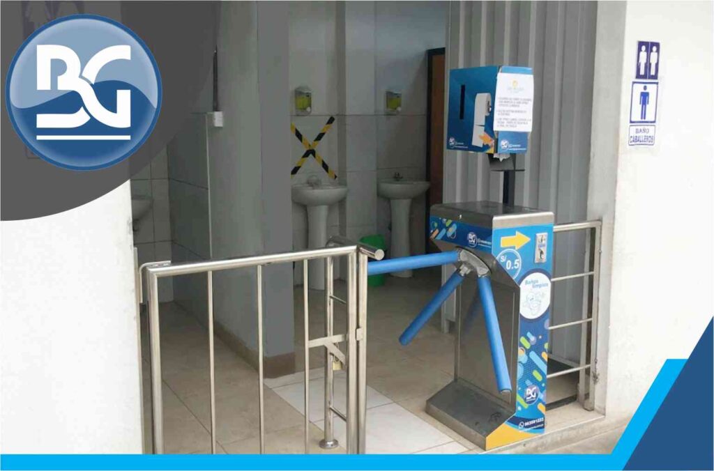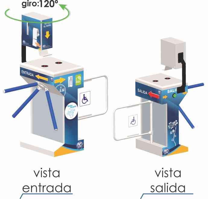 El torniquete BGTT-314 es un equipo que cuenta con una puerta columpio electrónica como salida, cuando el cliente sale del baño la puerta se cierra automáticamente protegiendo el ingreso. El equipo NO NECESITA UNA PERSONA PEREGNE AL CUIDADO DE LA ENTRADA ya que entrega papel de forma automática.