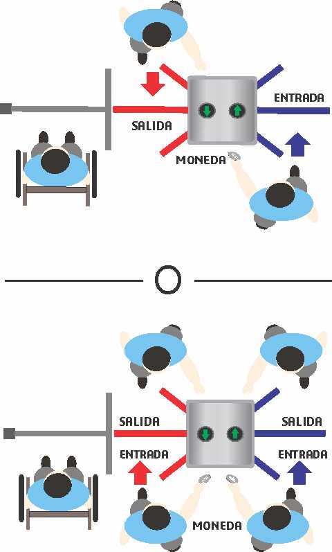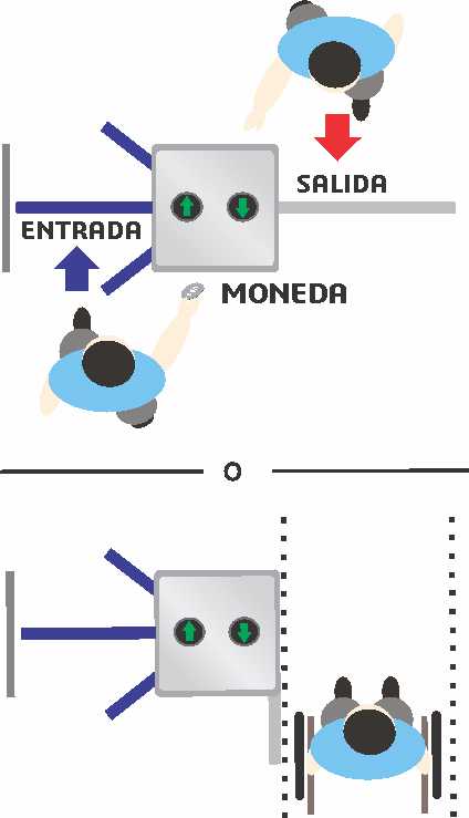 PROCEDIMIENTO: 1.- El cliente ingresa la moneda(el valor de la moneda es establecido por la administración) 2.- De forma inmediata la papelera proporciona papel higiénico (la longitud de papel es establecida por la administración, si el cliente quiere retirar más papel de lo permitido la máquina no le permitirá). 3.- Ingresa el cliente. 4.- Una vez usado el servicio el cliente se retira por la puerta columpio presionando un botón.