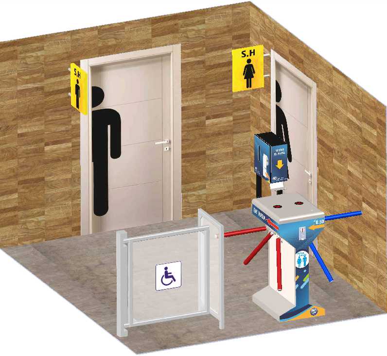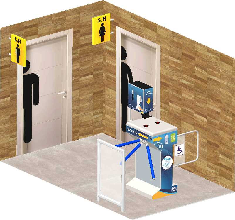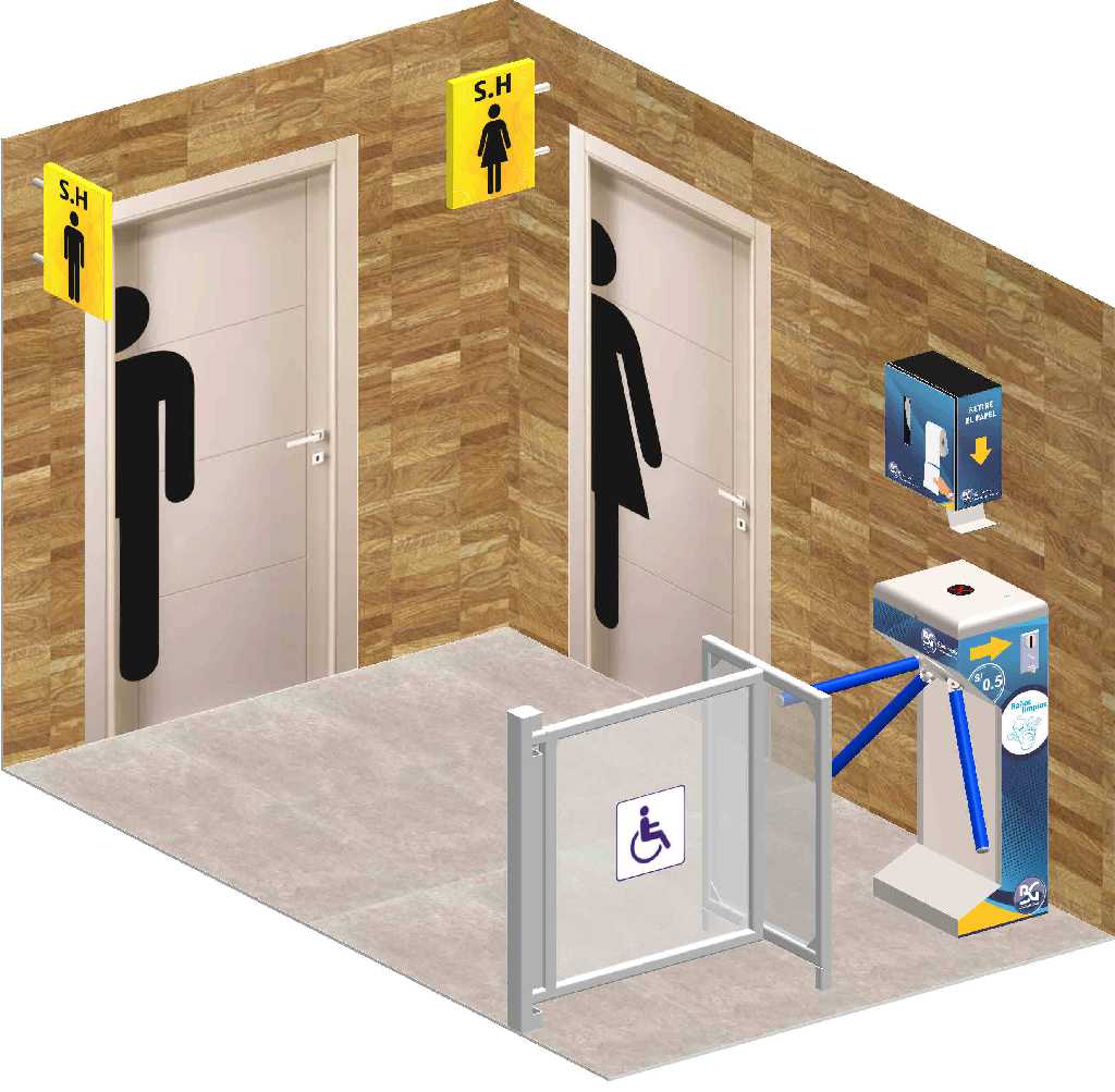 Este equipo esta diseñado para ingreso de baños públicos con puertas superiores a los 1.60 m de ancho y un a clientela mayor a las 800 personas por día, La mayor ventaja es que al abrirse la puerta de salida permite ingresar una silla de ruedas con ayuda del operario del baño.