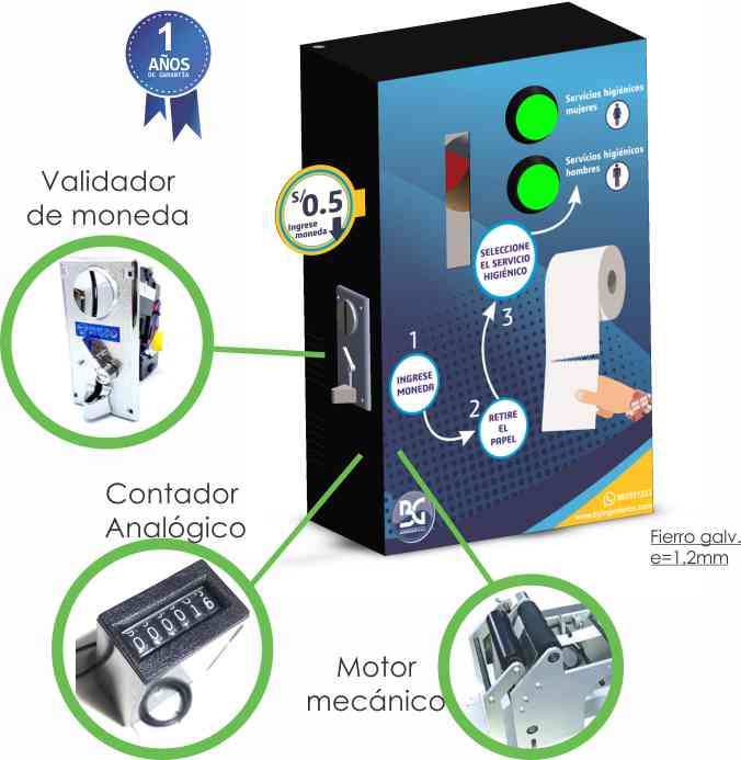 El equipo BGTT-816 es un equipo compacto que puede ser usado para la venta de papel higiénico o controlar el ingreso de baños públicos con poca afluencia de clientes.